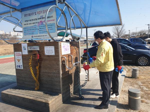 이를 위해 구리시청 도로과 직원들은 자전거도로 총 80km에 설치된 공기자전거 주입기 17개소, 자전거보관대 105개소, 교량 3개소, 인도교 5개소에 대해 매주1~2회 직접 현장소독을 실시했다.