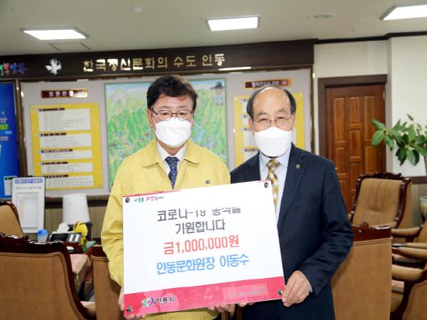 안동문화원 이동수 원장이 3월 10일 시청을 방문해 100만 원의 성금을 기탁한 데 이어 같은 날 도산서원 선비문화수련원 직원 일동이 200만 원을 기탁했고, 지난 9일에는 농업회사법인 과일드림 황찬성 대표가 안동의료원과 보건소에 컵 과일 각각 250개를 전달했다.