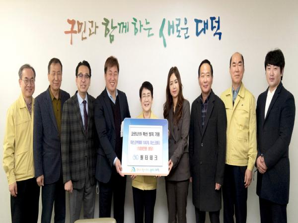 대덕구 덕암동에 위치한 필터테크(대표이사 박서윤, 홍재의)가 11일 코로나19 확산 방지를 위해 미세먼지골키퍼 넥워머 100개, 미세먼지필터(189만 원 상당)를 대덕구(구청장 박정현)에 기탁했다.