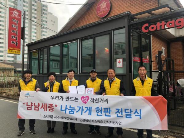 세종특별자치시 조치원읍 지역사회보장협의체(민간위원장 김동진)와 침산리 상가번영회(회장 이기홍)가 10일 관내 소상공인 업소 2곳에서 나눔가게 현판식을 열고 ‘냠냠세종’ 사업의 출발을 알렸다.