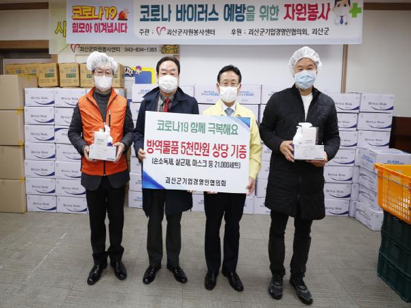 이날 괴산군기업경영인협의회가 전달한 방역물품은 마스크를 비롯해 손소독제와 살균제 등이다.
