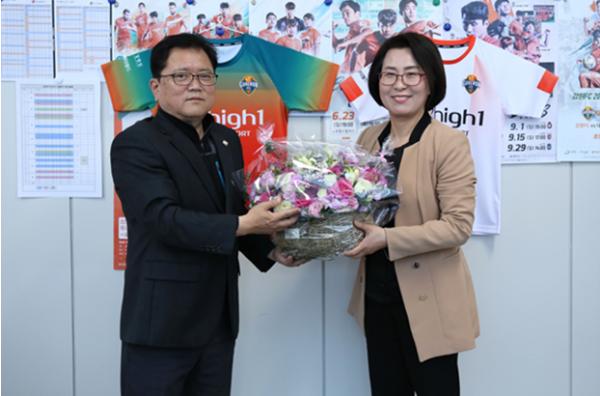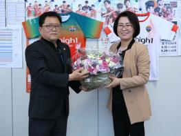 이경희 강원도 정책기획관이 2020. 3. 10. 11:00, 강원FC 춘천 사무국(송암스포츠타운 2층)에서 ‘플라워버킷챌린지’운동으로 박종완 강원FC 대표이사에게 꽃바구니를 전달한다.