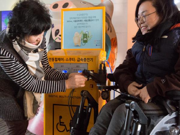 전동휠체어 급속충전기는 휠체어의 전력이 소진되면 이동에 어려움을 겪는 불편을 줄이고자 장애 예술인과 시민의 방문이 많은 ▲서울문화재단 본관(동대문구 청계천로 517) ▲잠실창작스튜디오(송파구 올림픽로 25) ▲남산예술센터(중구 소파로 138) 등 3곳에 마련했으며 누구나 무료로 이용할 수 있다.