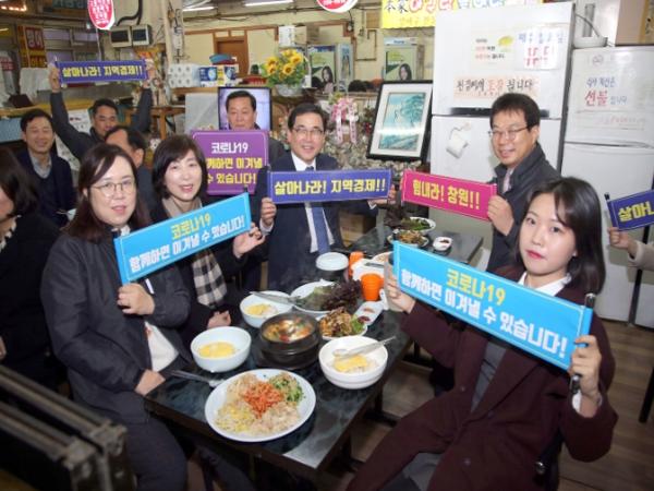 허성무 창원시장은 자치행정국 직원 120명과 함께 코로나19로 극심한 침체를 겪고 있는 식당 자영업자들의 응원하기 위해 가음정종합상가 보리밥 식당을 찾아 식사하며 상인들을 격려하는 시간을 가졌다.