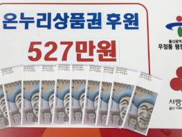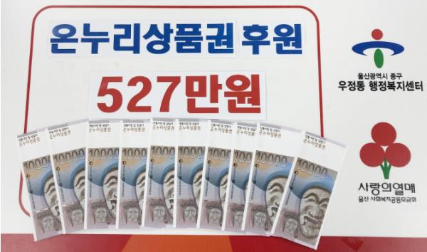 우정동 행정복지센터는 기탁자의 뜻에 따라 전달받은 온누리상품권 527매를 지역 내 저소득층인 기초생활수급자와 차상위계층 107세대에 4~5만원씩 전달할 예정이다.