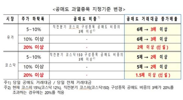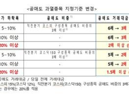 아울러 주가가 당일 20% 이상 하락한 종목은 공매도 거래대금 증가배율을 코스피 2배, 코스닥 1.5배로 하는 지정기준을 새로 만들었다.