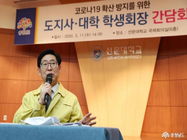 도는 11일 선문대 국제회의실에서 ‘코로나19 확산 방지를 위한 도지사-대학 학생회장 간담회’를 개최했다.