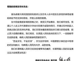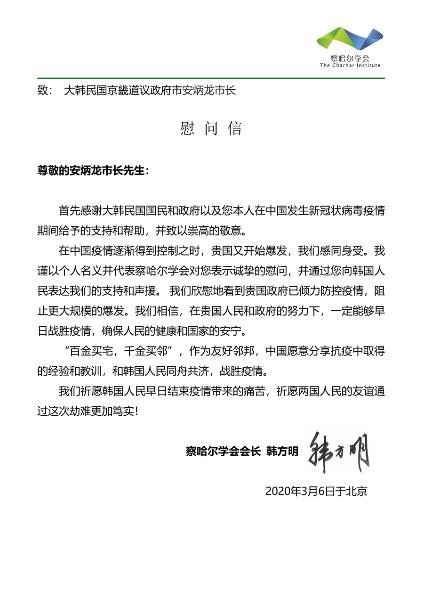 의정부시(안병용 시장)는 3월 6일 중국 차하얼학회 한팡밍(韓方明) 회장으로부터 코로나바이러스 감염증-19(코로나19) 확산과 관련, 감사와 위로가 담긴 공식서한을 받았다.