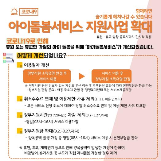 코로나19로 인한 휴원, 휴교, 개학연기 조치에 따라 가족돌봄 휴가, 시설 긴급보육 등을 이용하기 어려운 가정에서 아이돌봄 서비스를 이용할 수 있다. 이용요금 9,890원 중 정부지원 비율을 40~90%까지 한시적으로 확대 지원한다.