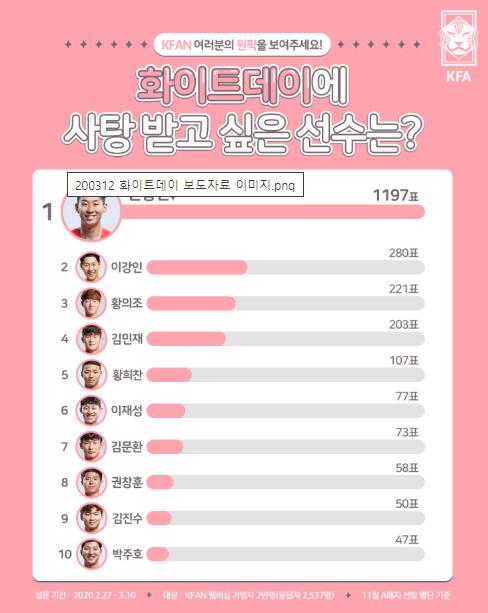 ‘KFAN 화이트데이 이벤트 : 여러분의 원픽을 보여주세요’란 타이틀로 진행된 설문조사에서 토트넘 홋스퍼의 손흥민이 응답자 2,584명 중 1,197명의 표(46%)를 받아 1위를 차지했다. 2위는 발렌시아의 이강인(280표 득표, 11%), 3위는 지롱댕 보르도의 황의조(221표 득표, 9%)가 선정됐다. 설문조사는 지난해 11월 A매치 원정 2연전(레바논, 브라질) 명단에 포함된 선수를 대상으로 실시했다.