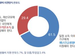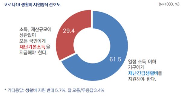 소득, 재산규모와 상관없이 모든 국민에게 재난기본소득을 지급해야 한다는 재난기본소득에 더 공감한다는 응답은 29.4%로 조사되었다.