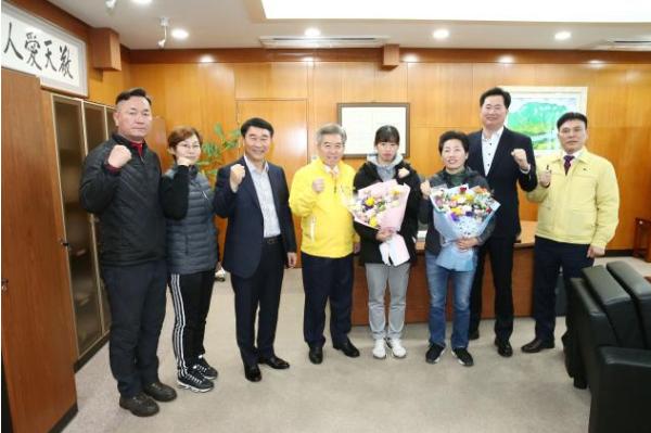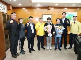 [한국4차산업신문] 구충곤 화순군수가 16일 오전 화순군청에서 한국 여자 복싱 최초로 올림픽 본선에 진출하게 된 임애지(21·한국체대) 선수를 만나 “한국 여자 복싱의 역사를 새로 쓴 것을 축하한다, 올림픽에서도 좋은 성적을 기대하겠다”며 격려했다.