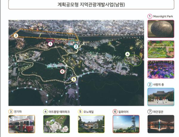 투입예산은 국비 100억, 도비 30억, 시비 100억을 포함하여 총 230억원이다. 사업계획을 구체적으로 보면, 대표적인 핵심인프라 사업으로 남원 켄싱턴리조트 옆 구)비사벌콘도 유휴부지 지하공간을 재생하여 남원의 스토리를 IT와 융합한 몰입형 미디어 아트 전시시설과 지상 1층에는 시민쉼터 및 편의공간과 옥상 꽃빛정원을 조성한다.