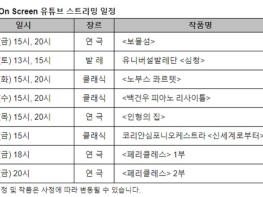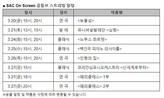 예술의전당(사장 유인택)이 코로나19로 문화예술 향유 기회를 상실한 국민들을 위해 'SAC On Screen'을 유튜브로 스트리밍 한다고 밝혔다. 기존에 지역의 소규모 문화시설이나 영화관에서 상영된 바 있으나, 온라인 플랫폼을 통한 송출은 이번이 처음이다. 코로나19가 확산되며 다중이용시설을 이용하기 어려운 국민들이 모바일, 태블릿 등 시공간 제약 없이 어디서나 공연영상 콘텐츠를 감상할 수 있도록 마련됐다.
