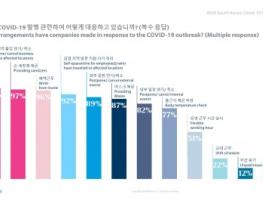 직원의 COVID-19 감염에 대비한 한국 내 기업의 가장 일반적인 조치는, 감염 지역으로의 출장을 연기하거나 취소(99%), 해외뿐 아니라 국내 감염 지역을 방문한 직원 약 2주간 자가격리(92%), 외부 일정 연기/취소(89%), 내부 일정 연기/취소(82%), 마스크 제공(87%) 등으로 현 상황에 여러 가지 방법으로 위기를 관리하고 있음을 보여준다.