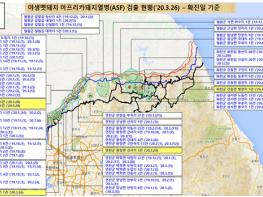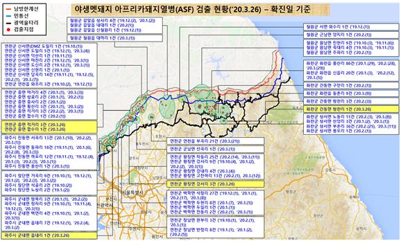 국립환경과학원은 3월 26일 폐사체 9개체에서 아프리카돼지열병 바이러스를 확진하고 결과를 관계기관에 통보했다. 이로써 연천군 172건, 화천군 171건, 파주시 82건, 철원군 23건, 총 448건의 멧돼지 아프리카돼지열병이 확진됐다.