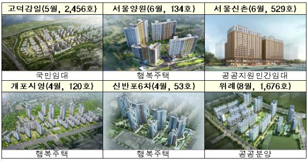 또한, 공공분양은 경기·인천에서 하남감일(210호)·양주옥정(2,049호) 등 8곳 7,206호, 지방에서 세종행정중심복합도시(1,000호)·경산하양(626호) 등 6곳 4,372호의 입주자 모집을 준비 중이며,
