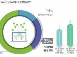 2018년 7월 1일부터 단계적으로 시행되고 있는 주 52시간 근무제를 응답자의 60%는 실행하고 있다고 응답하고, 내년까지 준비 중이라는 답변도 25%가 나와서 내년이면 국내 기업의 85%는 이 제도를 시행할 것으로 예상된다.