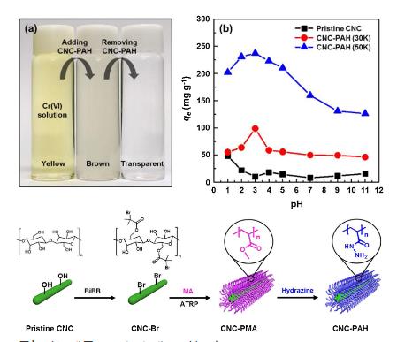 국립산림과학원 연구팀은 크롬에 대한 흡착성능이 우수한 고분자(poly acryloyl hydrazide)를 나노셀룰로오스 표면에 접합(polymer grafting)시키고, 부착된 고분자의 길이를 조절하는 방법을 통해 크롬 흡착 효율을 획기적으로 높였다.