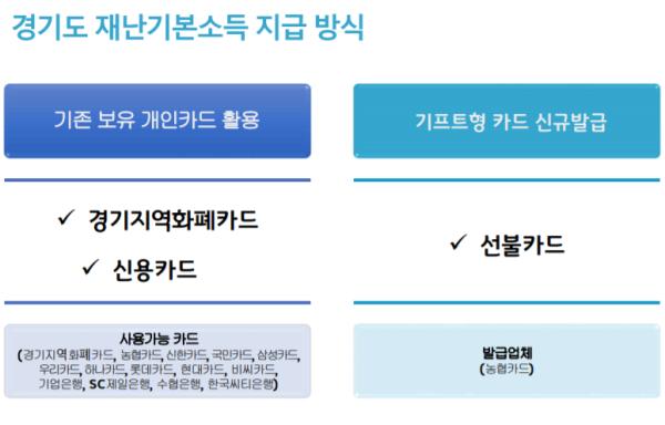 지급 방식은 자신이 사용하는 경기지역화폐카드나 신용카드를 이용해도 되고, 카드가 없는 사람은 가까운 읍·면·동 행정복지센터 또는 농협 지점을 찾아 선불카드를 신청해도 된다. 어렵거나 불편해서 경기도 재난기본소득을 받지 못하는 일이 없도록 하겠다는 것이 경기도의 설명이다.
