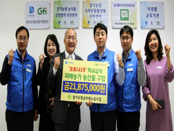 경기도청공무원노동조합(위원장 유관희)은 4월 1일(수) 경기농식품유통진흥원에 방문하여 ‘코로나19’로 인한 학교급식 지연으로 어려움을 겪고 있는 농가를 돕기 위한 잡곡 21,875,000원어치를 구입했다.