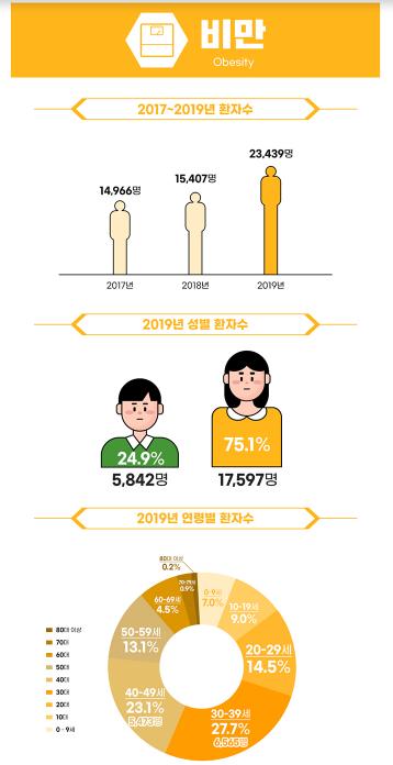 건강보험심사평가원의 통계자료에 따르면 2019년에 비만으로 진료 받은 환자의 수는 2만 3439명입니다, 환자 수가 1만 4966명이던 2017년부터 꾸준하게 증가하고 있는데요. 비만의 경우 남성(24.9%)에 비해서 여성(75.1%) 환자수가 높습니다. 또한 고연령층보다는 30~40대 중장년층에서 두드러지게 나타나고 있는 질병입니다.