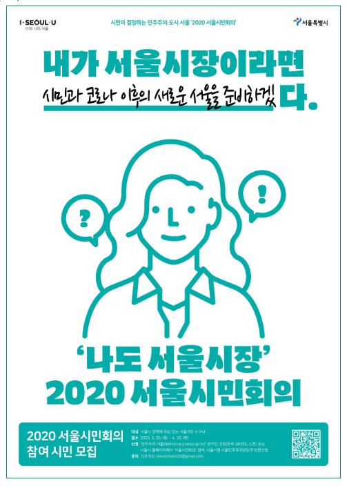이와 관련해 서울시는 ‘2020 서울시민회의’에 참여할 시민을 3월30일(월)~4월30일(목) 공개모집한다. 서울시 정책에 관심 있는 서울시민이라면 나이제한 없이 누구나 참여할 수 있다.