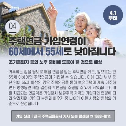 [한국4차산업신문] 거주하는 집을 담보로 매달 연금을 받는 주택연금 제도, 앞으로는 만 55세 이상이면 주택연금에 가입할 수 있습니다.