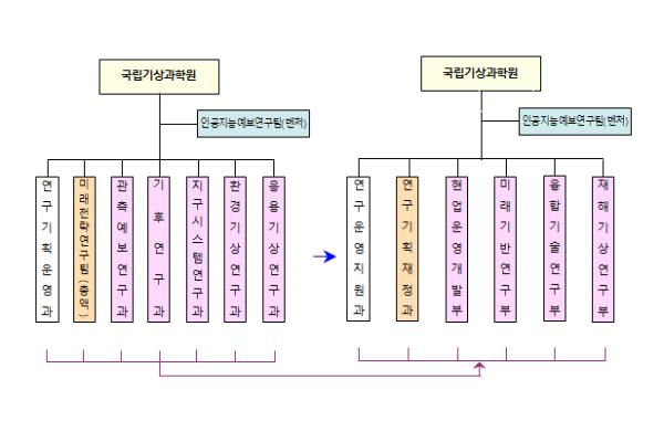 개편안에 따르면 국립기상과학원의 연구기획과 연구수행 업무가 혼재하던 기존의 6과 2팀 체제를, 연구지원 업무를 수행하는 ‘2과’와 연구에 집중하는 ‘4부 1팀’으로 재편성했다.