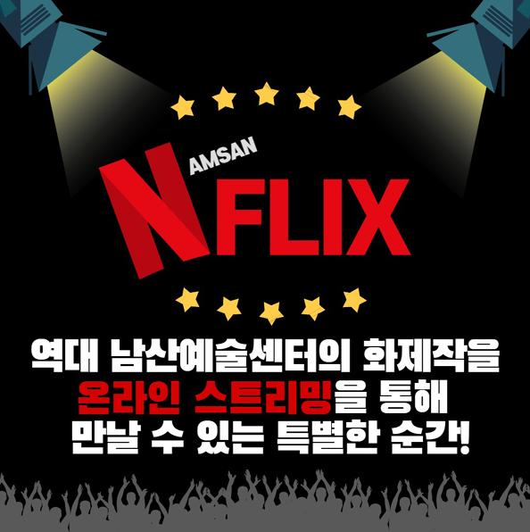 둘째, “임시휴관 기간인 4월 한 달 동안 남산예술센터는 코로나19로 인해 힘겨운 시간을 보내고 있는 연극인과 관객 모두가 서로에게 힘과 응원을 보내는 ‘흩어진 객석의 연대’, ‘흩어진 관객의 연대’를 바라며, 그동안 화제작을 모아 ‘남산예술센터 NFLIX’ 상영회를 개최한다.” 첫 번째 상영작은 소설가 장강명의 동명 소설을 무대로 옮긴 '그믐, 또는 당신이 세계를 기억하는 방식'(각색 정진새, 연출 강량원)을 9~12일에, 블랙리스트 시대에 국가폭력의 문제를 비판적으로 성찰한 '모든 군인은 불쌍하다'(작·연출 박근형)를 13~15일에, 삼성 반도체 백혈병 사건과 군 의문사를 다룬 '7번국도'(작 배해률, 연출 구자혜)를 20~22일에, 세월호 6주기인 4월 16일부터는 세월호 참사로 딸을 잃은 어머니들의 이야기를 담은 '그녀를 말해요'(공동창작 크리에이티브VaQi, 구성·연출 이경성)를 16~19일에, 삼국유사 웅녀 신화를 모티브를 얻은 '처의 감각'(작 고연옥, 연출 김정)을 23~26일, 한국 사회에 만연한 근본주의, 폭력, 혐오를 적나라하게 내보인 '파란나라'(작·연출 김수정, 공동제작 극단 신세계)를 27~30일에 제공한다. 이 작품들은 해당 작품 상영일 오전 10시부터 종료일 오후 10시까지 서울문화재단 공식 유튜브 채널(www.youtube.com/user/sfacmovie)과 네이버TV(https://m.tv.naver.com.sfacmovie/home)를 통해 무료로 공개된다.
