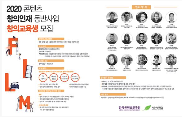 한국콘텐츠진흥원(원장 김영준)과 서경대학교 산학협력단(단장 이석형)은 2020년 콘텐츠 창의인재동반사업에 참여할 창의교육생(영화 시나리오 작가)을 모집한다.