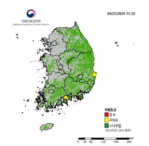 [한국4차산업신문] 산림청 국립산림과학원(원장 전범권) 산불예측·분석센터는 금일(23일) 낮 동안은 전국에 6∼11m/s의 강풍이 불고, 내일부터 모레(25일)까지는 강원 영동 북부, 경남 해안에는 9∼16m/s의 거센 바람이 예상됨에 따라 강원지역 및 경북· 경남 ·부산· 울산 지역에 대형산불 위험주의보를 발령하였다.