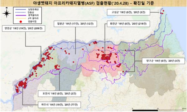 특히, 기존에 수색과 주민신고 등을 통한 폐사체 발견이 적어 감염 여부를 확인하기 어려웠던 연천군 미산면 및 신서면 일부, 화천군 사내면 및 하남면 일부, 양구군 양구읍·방산면 지역의 경우,이번 일제 수색 기간 인원을 집중적으로 투입했음에도 폐사체가 거의 발견되지 않았다.