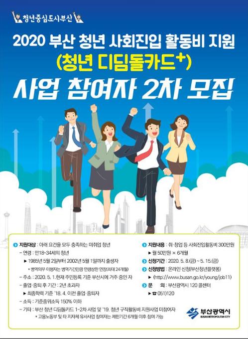 부산시(시장 권한대행 변성완)는 미취업 청년들의 취·창업 활동을 지원하기 위한 「2020 청년 사회진입활동비 지원(청년 디딤돌 카드+)’ 사업」 참여자 2차 모집을 한다고 밝혔다.