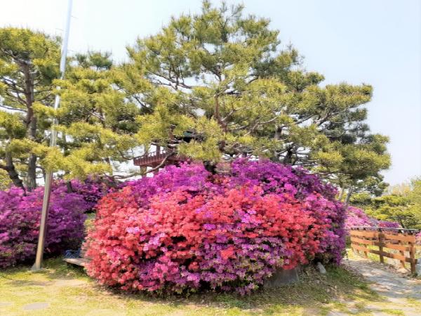 여주(시장 이항진) 영월근린공원에 식재된 봄꽃의 대명사 철쭉이 색색의 꽃망울을 터트리며 남한강과 어우러져 공원을 화사한 빛으로 물들이고 있다