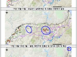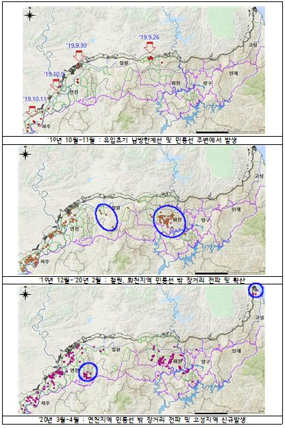다만 기존 발생지역에서 멀리 떨어진 곳(7~33km)에서 새롭게 발생한 화천군 풍산리, 연천군 부곡리, 양구군 수인리 등 일부 사례는 수렵활동이나 사람, 차량 이동 등 인위적 요인이 영향을 미쳤을 것으로 추정되며, 향후 전파경로에 대해서는 면밀한 조사가 필요한 것으로 나타났다.