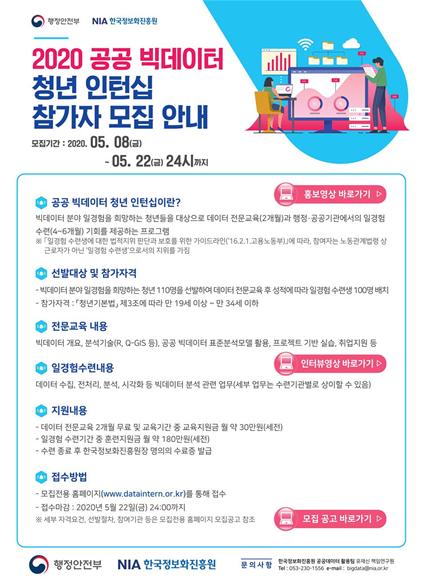 행정안전부(장관 진영)는 데이터 전문가 양성을 위해 5월 8일부터 “공공 빅데이터 청년 인턴십”2기 참가자 100명을 모집한다고 밝혔다.