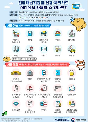 행정안전부(장관 진영)는 5월 11일(월) 긴급재난지원금 신용·체크카드 충전 신청 첫 날 18시 기준, 전국 154만여 가구가 총 1조 375억원을 신청하였다고 밝혔다.