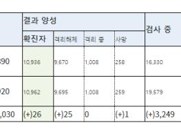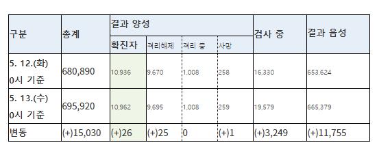 [한국4차산업신문] 질병관리본부 중앙방역대책본부(본부장 정은경)는 5월 13일 0시 현재, 신규 확진자가 26명 발생하여 총 누적 확진자수는 10,962명(해외유입 1,142명(내국인 90.2%))이라고 밝혔다. 신규 격리해제자는 25명으로 총 9,695명(88.4%)이 격리해제 되어, 현재 1,008명이 격리 중이다.