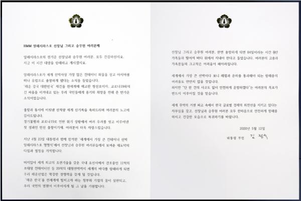 김정숙 여사의 축하 편지 원본은 한국어와 영어(필리핀 국적 승무원 전달용)로 작성되어 HMM 알헤시라스호의 다음 기착 예정 항구인 로테르담에서 승무원들에게 전달될 예정이다.