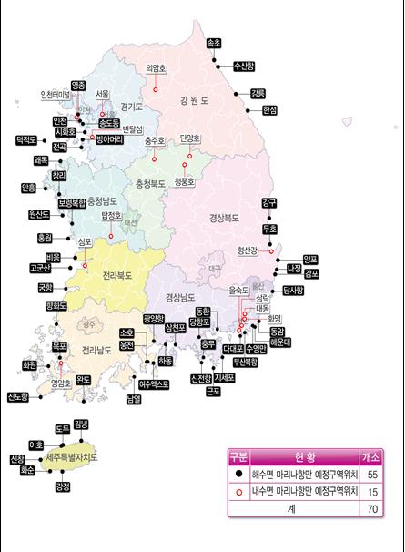 이에, 해양수산부는 지자체를 대상으로 수요 조사를 실시하고 전문가 평가를 거쳐 전국 9개 권역에 70개소(해수면 55, 내수면 15)의 마리나항만 예정구역을 선정하였다. 마리나항만 예정구역은 전국 연안 중 마리나항만을 조성하기에 적합한 여건을 갖춘 지역으로, 이번 지정에 따라 앞으로 지자체나 민간의 투자가 활성화될 것으로 기대된다.