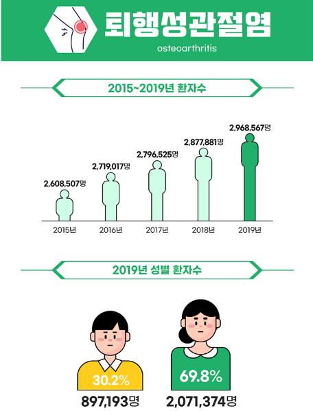 건강보험심사평가원의 통계자료에 따르면 2019년 무릎관절증으로 진료받은 환자의 수는 296만 8567명입니다. 환자 수가 260만 8507명이던 2015년에 비해서 꾸준하게 증가하고 있는 질병입니다. 무릎관절증은 여성에게 더 많이 나타나는 질병이므로, 50세 이상 여성이라면 특히 눈여겨 봐주세요.