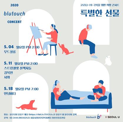 시는 18일 오후 7시 유튜브 블루터치 채널((https://bit.ly/2VGXtyJ)에서「코로나19 극복을 위한 희망콘서트 ‘특별한 선물’」공연을 열어, 인디 록밴드 ‘안녕바다’가 시민의 마음을 달래 줄 예정이다.