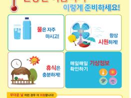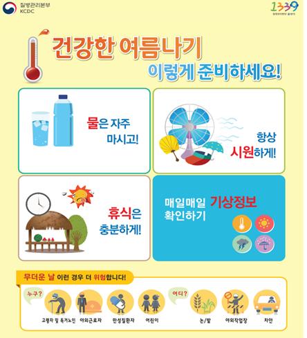 또한 “어린이와 노약자, 만성질환자(심뇌혈관·당뇨병·치매·정신질환 등)는 온열질환에 더욱 취약하므로 본인은 물론 보호자와 주변인이 각별한 관심을 기울여주기를 당부드린다”고 밝히며, “더운 날에는 특히 수시로 어린이와 노약자의 건강상태를 살피고, 집안과 차 등 창문이 닫힌 실내에 어린이나 노약자를 홀로 남겨 두지 않도록 하며, 부득이 어린이나 노약자를 남겨두고 장시간 외출할 때에는 이웃이나 친인척에게 보호를 부탁할 것”을 당부하였다.