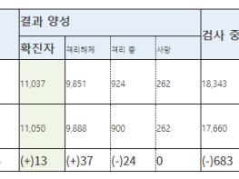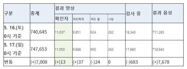 [한국4차산업신문] 질병관리본부 중앙방역대책본부(본부장 정은경)는 5월 17일 0시 현재, 신규 확진자가 13명 발생하여 총 누적 확진자수는 11,050명(해외유입 1,167명(내국인 89.2%))이라고 밝혔다. 신규 격리해제자는 37명으로 총 9,888명(89.5%)이 격리해제 되어, 현재 900명이 격리 중이다.