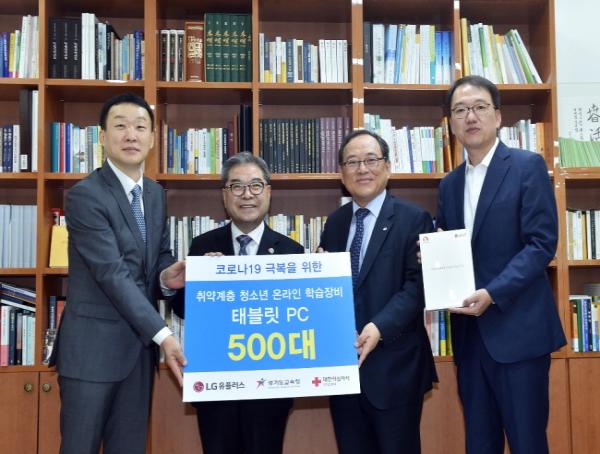 LG U 가 대한적십자사 경기지사(회장 윤신일)를 통해 경기도교육청에 4월 말 지정 기탁한 스마트기기는 5천 6백만 원 상당의 태블릿PC 500대 분량이며, 코로나19로 인한 원격수업 지원용이다.