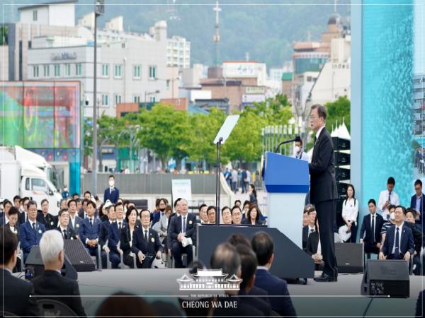 문재인 대통령은 기념사를 통해 "오월 광주로부터 40년이 되었다"며 "시민과 함께하는5·18, 생활 속에서 되살아나는 5·18을 바라며, 정부는 처음으로 기념식을 이곳 전남도청 앞 광장에서 거행한다"고 말했다.