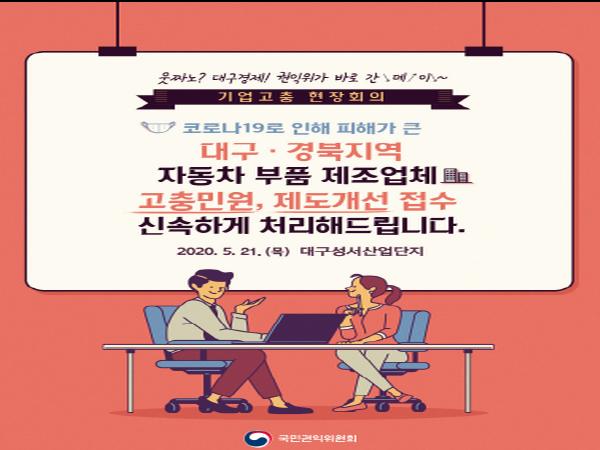 국민권익위원회(위원장 박은정)는 이번 달 21일 권태성 부위원장 주재로 대구신용보증기금(본점, 대구지점)과 함께 대구·경북지역 코로나19 피해기업들의 경영자금 문제를 청취하고 성서산업단지 내 자동차부품 제조업체들을 찾아 ?기업고충 현장회의?를 진행한다.