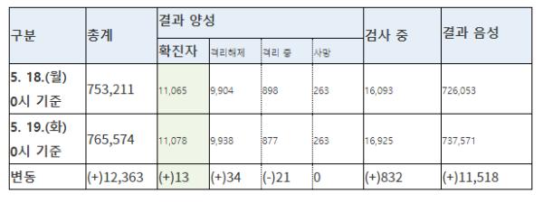 [한국4차산업신문] 질병관리본부 중앙방역대책본부(본부장 정은경)는 5월 19일 0시 현재, 신규 확진자가 13명 발생하여 총 누적 확진자수는 11,078명(해외유입 1,181명(내국인 89.2%))이라고 밝혔다.