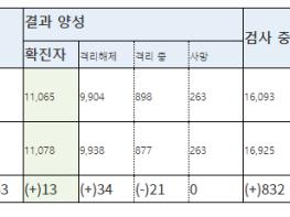신규 격리해제자는 34명으로 총 9,938명(89.7%)이 격리해제 되어, 현재 877명이 격리 중이다.